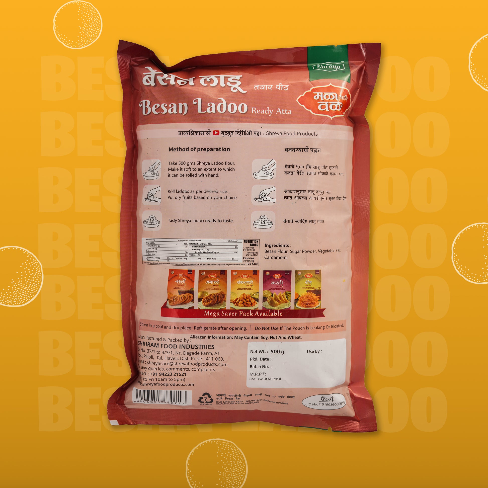 Make soft, delicious Besan Laddus at home without the hassle. Shreya’s Besan Ladoo Ready Mix Flour is crafted from hygienic, high-quality ingredients ensuring authentic taste and easy preparation. Just unpack, roast lightly, shape into laddus—and enjoy the perfect festive treat. Also available in a pure ghee variant for that rich, traditional flavor.